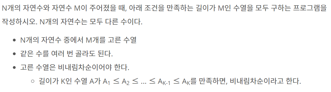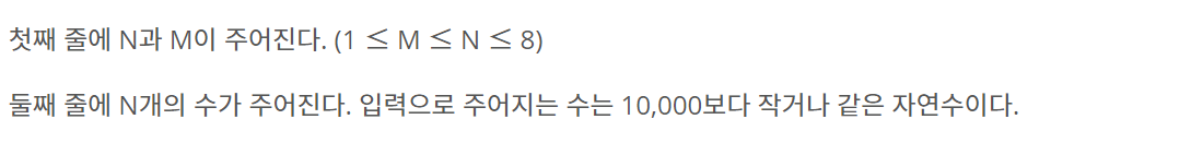 N개의 자연수와 자연수 M이 주어졌을 때, 아래 조건을 만족하는 길이가 M인 수열을 모두 구하는 프로그램을 작성하시오. N개의 자연수는 모두 다른 수이다. N개의 자연수 중에서 M개를 고른 수열