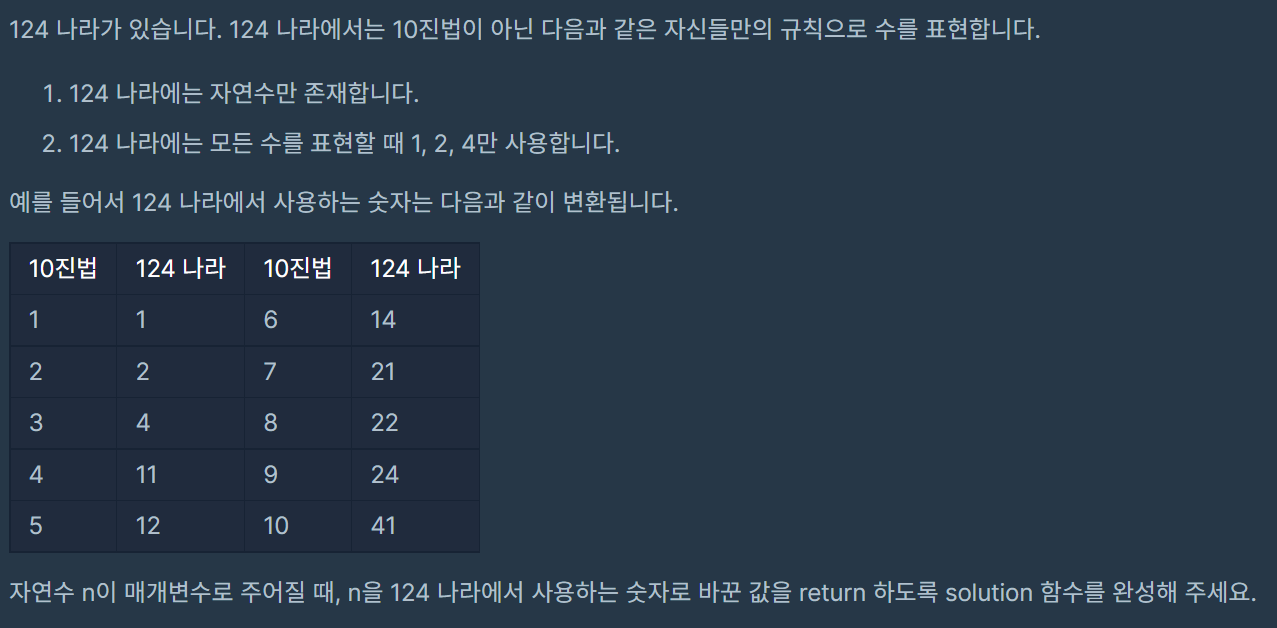 그리고 n의 값을 124진법으로 다 소모할 때까지 반복문을 돌리고 싶었다.