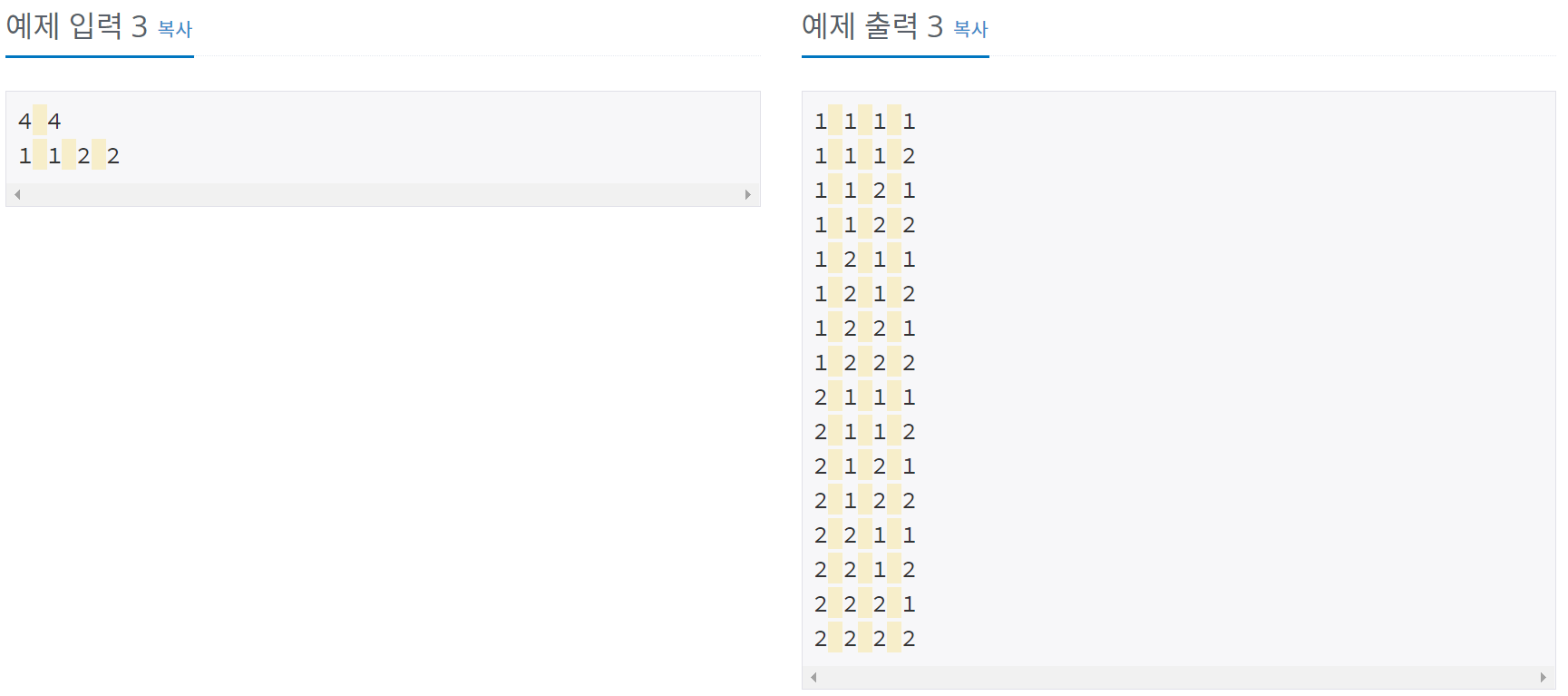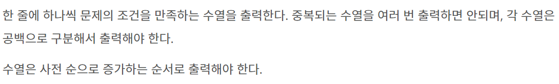 한 줄에 하나씩 문제의 조건을 만족하는 수열을 출력한다. 중복되는 수열을 여러 번 출력하면 안되며, 각 수열은 공백으로 구분해서 출력해야 한다. 수열은 사전 순으로 증가하는 순서로 출력해