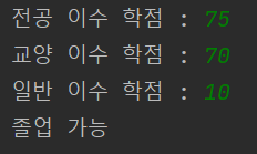 대학을 졸업하려면 최소 140학점을 이수해야 한다고 하자. 이수한 학점 중 전공은 70학점 이상이어야 하며, 교양과 일반은 각각 30학점 이상이거나 총점이 80학점 이상이어야 한다. 이수한 학점을 각각 키보드로 입력받아 졸업 여부를 출력하는 프로그램을 작성하시오.