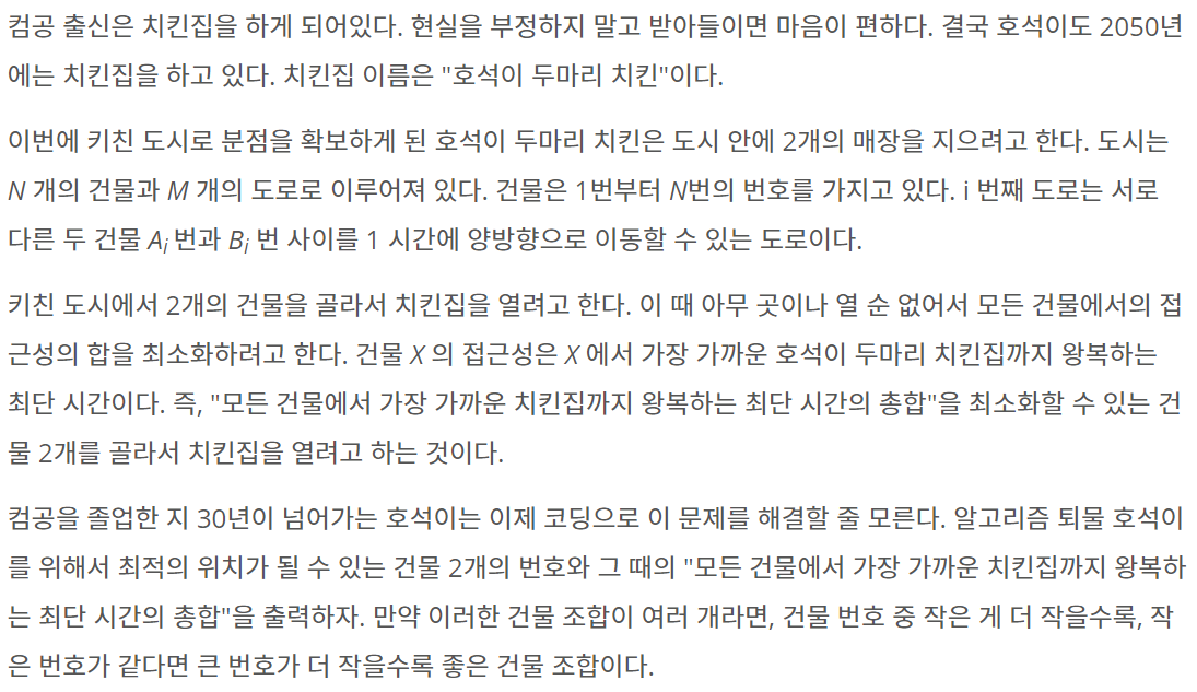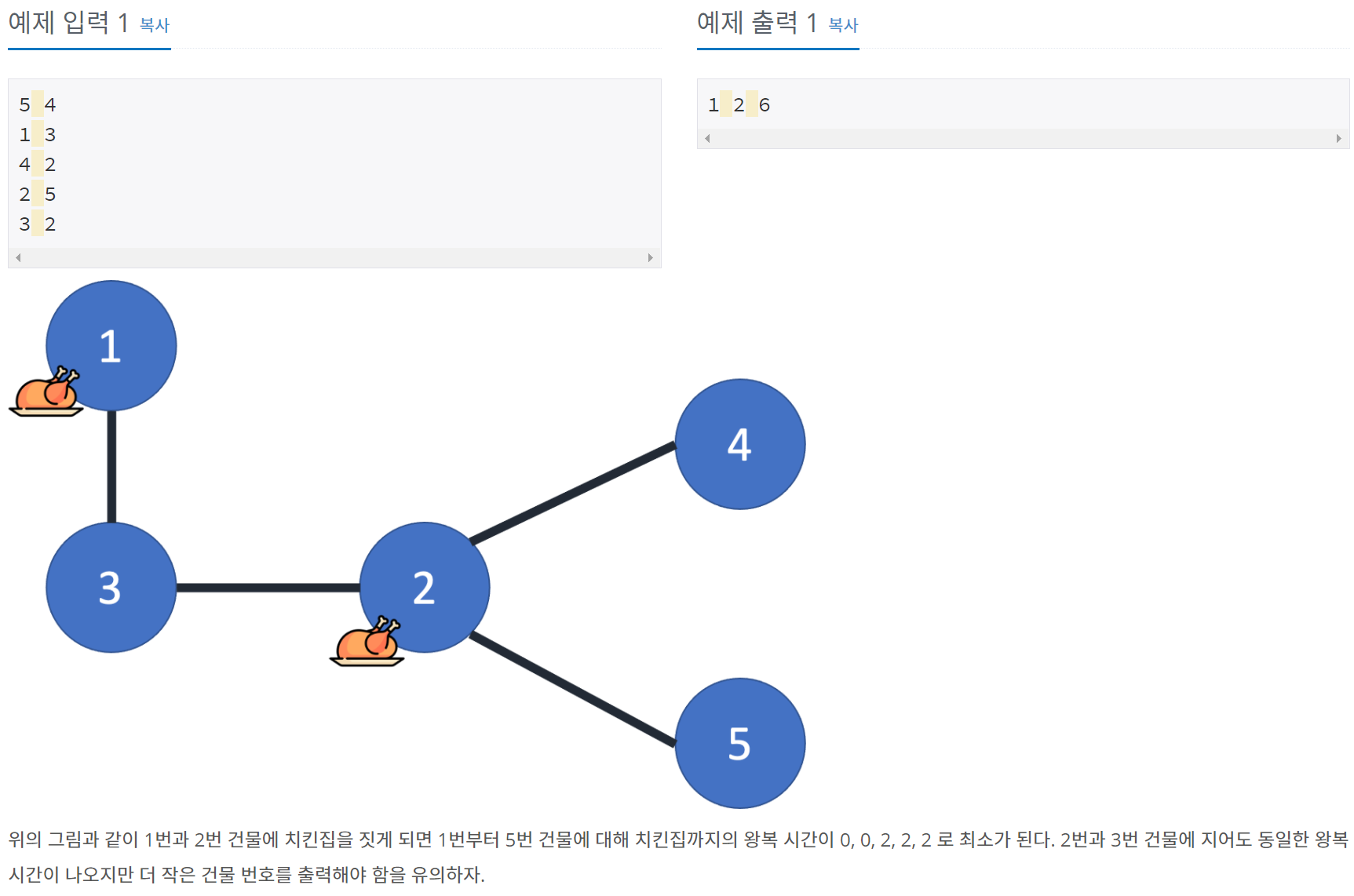 위의 그림과 같이 1번과 2번 건물에 치킨집을 짓게 되면 1번부터 5번 건물에 대해 치킨집까지의 왕복 시간이 0, 0, 2, 2, 2 로 최소가 된다. 2번과 3번 건물에 지어도 동일한 왕복 시간이 나오지만 더