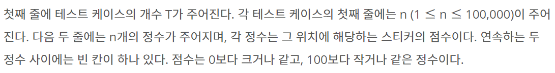 첫째 줄에 테스트 케이스의 개수 T가 주어진다. 각 테스트 케이스의 첫째 줄에는 n (1 ≤ n ≤ 100,000)이 주어진다. 다음 두 줄에는 n개의 정수가 주어지며, 각 정수는 그 위치에 해당하는 스티커의
