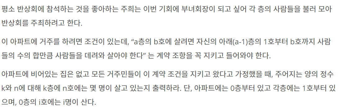 배열 arr[i][j]가 있다면 바로 아래인 i-1층의 1부터 j까지의 합이다.