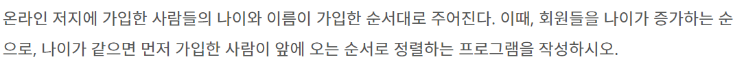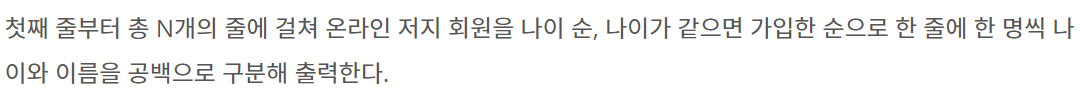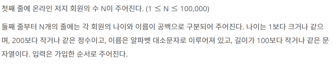 온라인 저지에 가입한 사람들의 나이와 이름이 가입한 순서대로 주어진다. 이때, 회원들을 나이가 증가하는 순으로, 나이가 같으면 먼저 가입한 사람이 앞에 오는 순서로 정렬하는 프로그램을