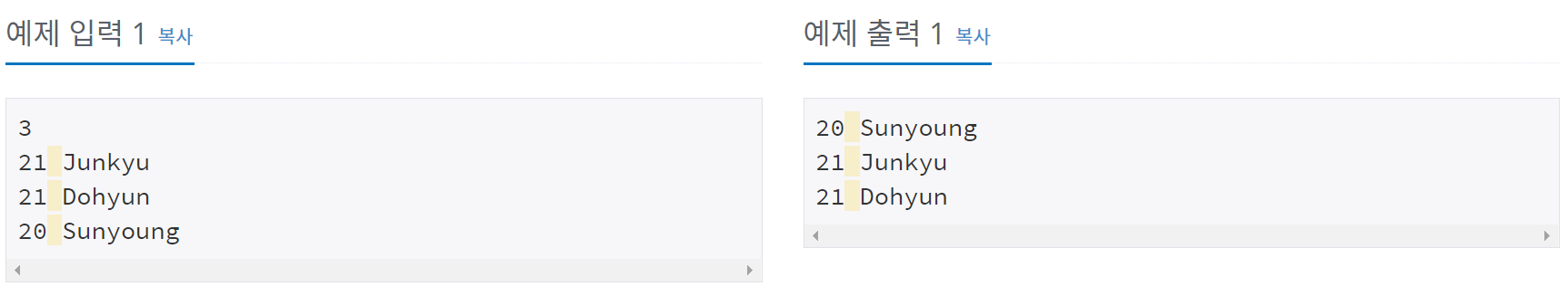 나이에 대해 정렬은 직접 구현하였고 순서대로 정렬한 int에 대해서 나이와 이름을 출력해줬다.