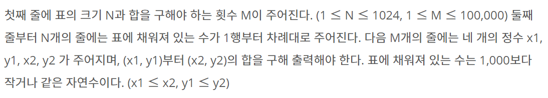 첫째 줄에 표의 크기 N과 합을 구해야 하는 횟수 M이 주어진다. (1 ≤ N ≤ 1024, 1 ≤ M ≤ 100,000) 둘째 줄부터 N개의 줄에는 표에 채워져 있는 수가 1행부터 차례대로 주어진다. 다음 M개의 줄에는 네