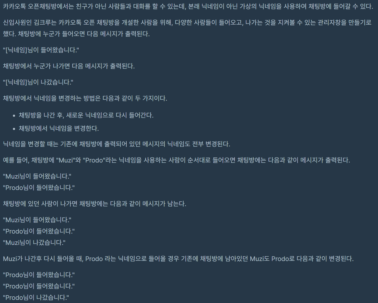오픈채팅방 카카오톡 오픈채팅방에서는 친구가 아닌 사람들과 대화를 할 수 있는데, 본래 닉네임이 아닌 가상의 닉네임을 사용하여 채팅방에 들어갈 수 있다. 신입사원인 김크루는 카카오톡 오