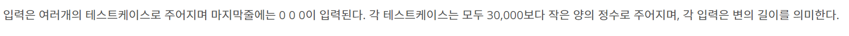 입력은 여러개의 테스트케이스로 주어지며 마지막줄에는 0 0 0이 입력된다. 각 테스트케이스는 모두 30,000보다 작은 양의 정수로 주어지며, 각 입력은 변의 길이를 의미한다.