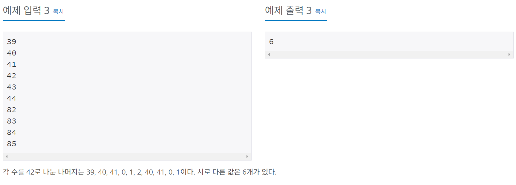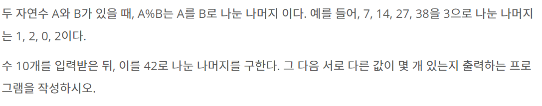 그래서 입력받은 값을 42로 나눈 나머지를 set에 다 때려 넣으면 중복을 제거하고 set에 들어간다.