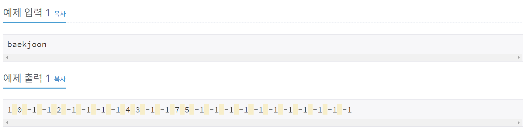 그리고 먼저 -1인지 아닌지 검사하고 -1이면 위치 체킹!-1이 아니라면 첫 번째로 나타난 알파벳이 아니니 패스!