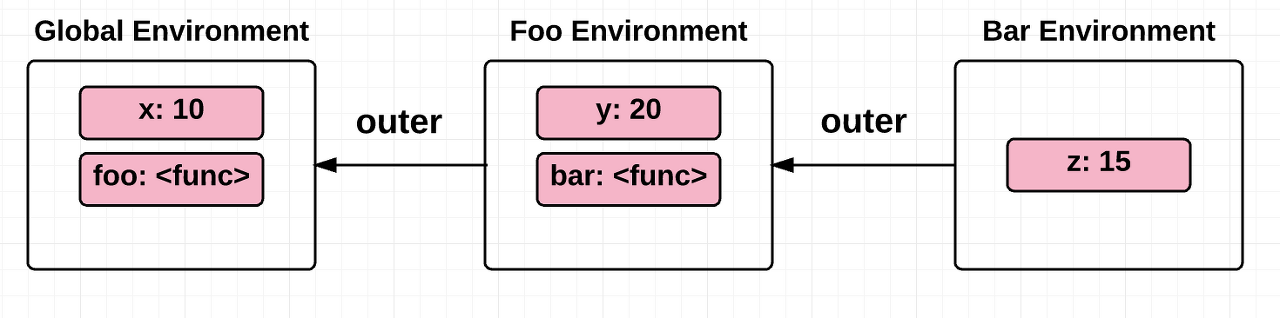 모든 스코프는 하나의 계층적 구조로 연결되어 전역에서 지역으로, 지역에서 하위 지역으로 체인같이 연결을 이룬다.