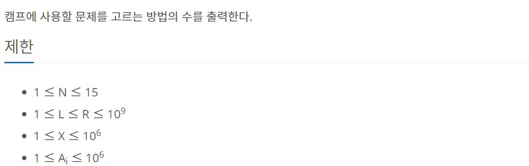 값을 입력받고 2개 이상부터 N개까지 조합을 해준다. 그리고 L <= sum <= R을 만족하고 가장 큰 값과 가장 작은 값의 합이 X이상인 조합이 있다면 count up을 해준다.