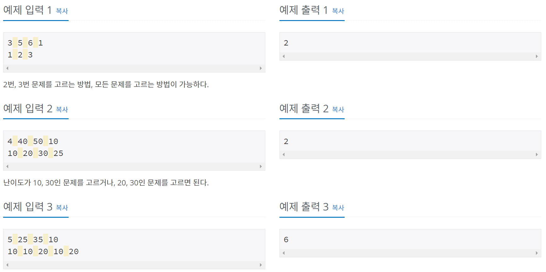 난이도가 10, 30인 문제를 고르거나, 20, 30인 문제를 고르면 된다.