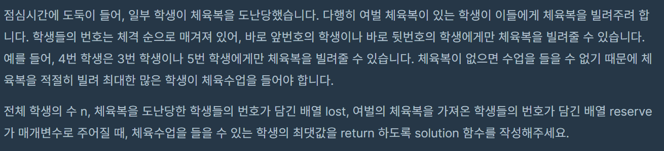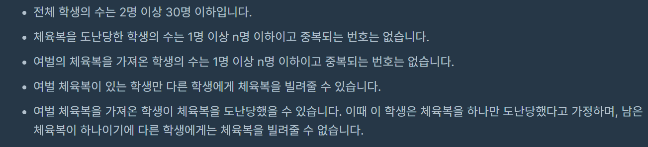 점심시간에 도둑이 들어, 일부 학생이 체육복을 도난당했습니다. 다행히 여벌 체육복이 있는 학생이 이들에게 체육복을 빌려주려 합니다. 학생들의 번호는 체격 순으로 매겨져 있어, 바로 앞번