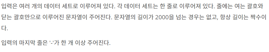 입력은 여러 개의 데이터 세트로 이루어져 있다. 각 데이터 세트는 한 줄로 이루어져 있다. 줄에는 여는 괄호와 닫는 괄호만으로 이루어진 문자열이 주어진다. 문자열의 길이가 2000을 넘는 경우