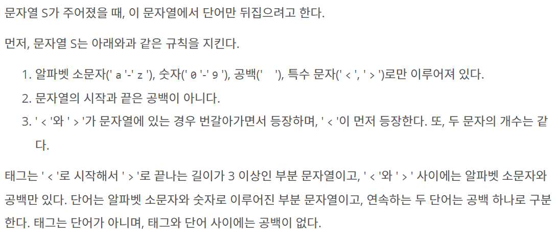 문자열 S가 주어졌을 때, 이 문자열에서 단어만 뒤집으려고 한다. 먼저, 문자열 S는 아래와과 같은 규칙을 지킨다. 알파벳 소문자('a'-'z'), 숫자('0'-'9'), 공백(' '), 특수 문자('<', '>')로만 이루어져