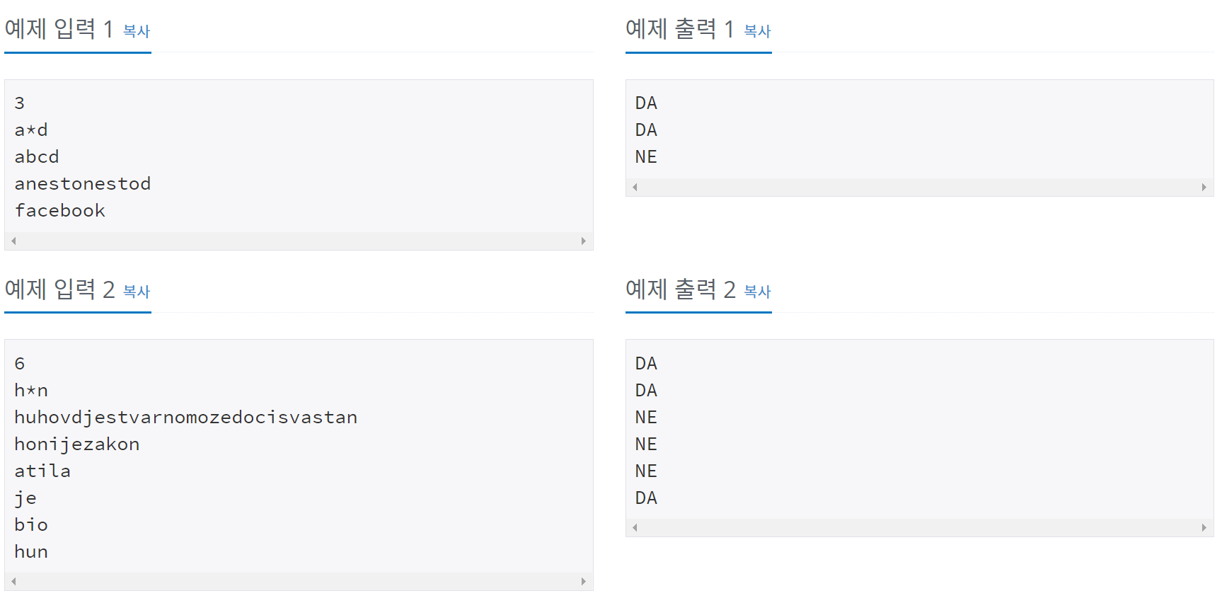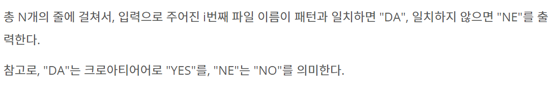 총 N개의 줄에 걸쳐서, 입력으로 주어진 i번째 파일 이름이 패턴과 일치하면 "DA", 일치하지 않으면 "NE"를 출력한다. 참고로, "DA"는 크로아티어어로 "YES"를, "NE"는 "NO"를 의미한다.