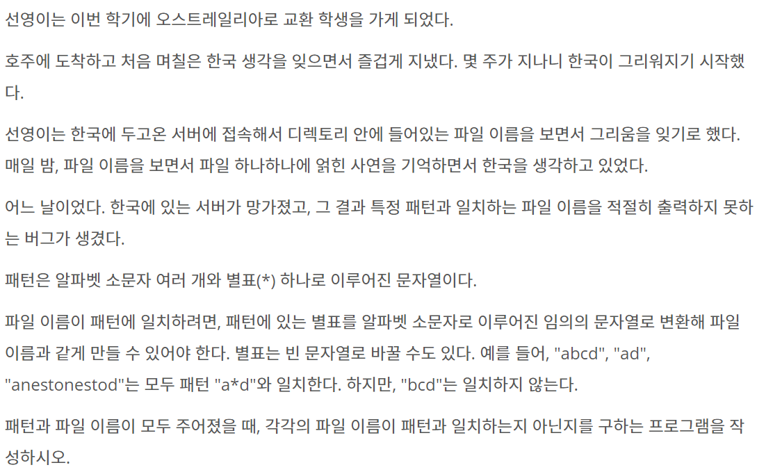 "패턴은 알파벳 소문자 여러 개와 별표(*) 하나로 이루어진 문자열이다."