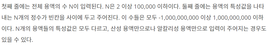 첫째 줄에는 전체 용액의 수 N이 입력된다. N은 2 이상 100,000 이하이다. 둘째 줄에는 용액의 특성값을 나타내는 N개의 정수가 빈칸을 사이에 두고 주어진다. 이 수들은 모두 -1,000,000,000 이상 1,000,00