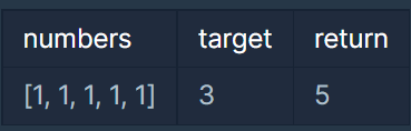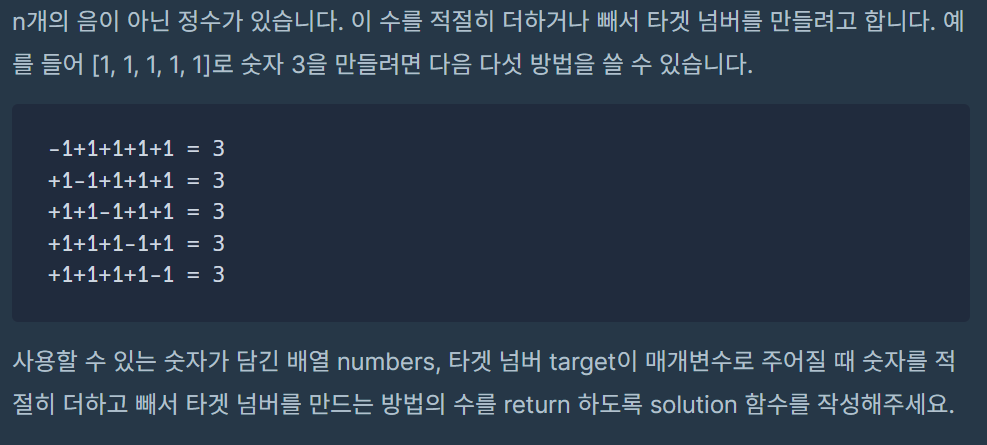 n개의 음이 아닌 정수가 있습니다. 이 수를 적절히 더하거나 빼서 타겟 넘버를 만들려고 합니다. 예를 들어 [1, 1, 1, 1, 1]로 숫자 3을 만들려면 다음 다섯 방법을 쓸 수 있습니다. -1+1+1+1+1 = 3 +1-1+1+1+
