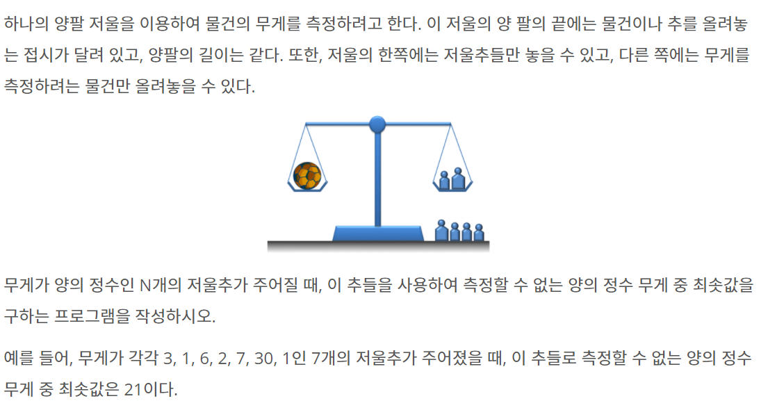 하나의 양팔 저울을 이용하여 물건의 무게를 측정하려고 한다. 이 저울의 양 팔의 끝에는 물건이나 추를 올려놓는 접시가 달려 있고, 양팔의 길이는 같다. 또한, 저울의 한쪽에는 저울추들만 놓