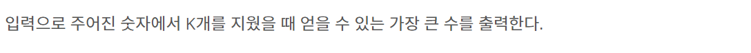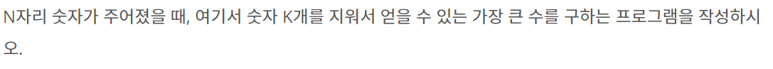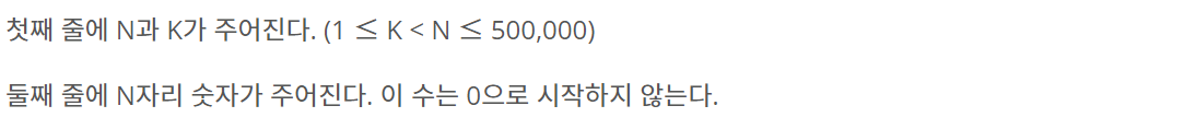 N자리 숫자가 주어졌을 때, 여기서 숫자 K개를 지워서 얻을 수 있는 가장 큰 수를 구하는 프로그램을 작성하시오.