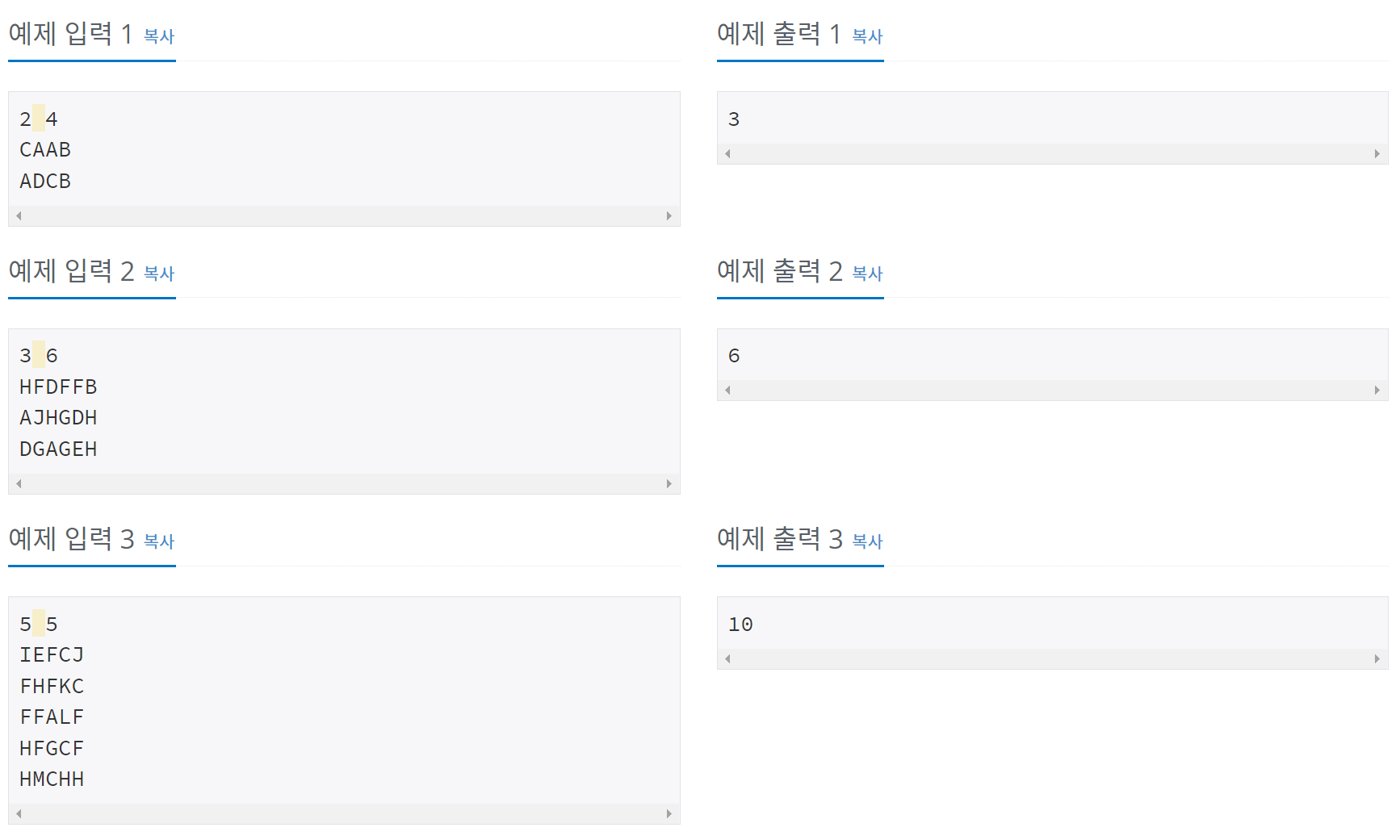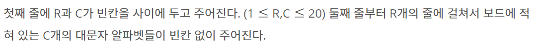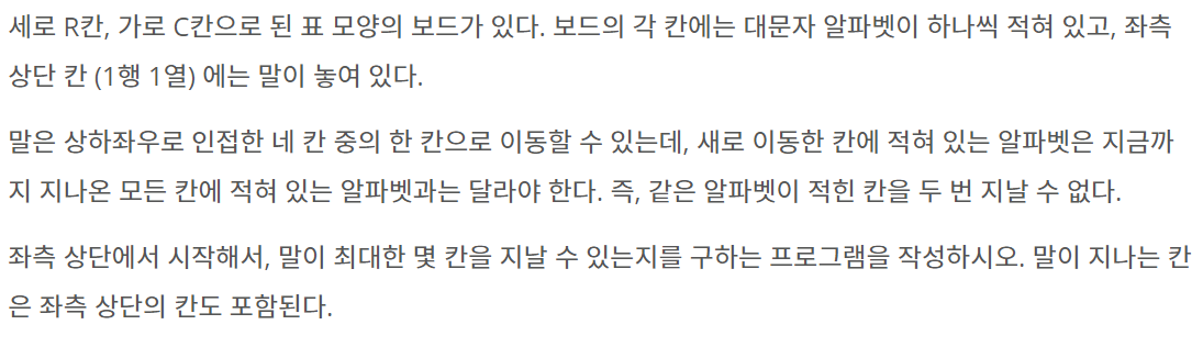 세로 R칸, 가로 C칸으로 된 표 모양의 보드가 있다. 보드의 각 칸에는 대문자 알파벳이 하나씩 적혀 있고, 좌측 상단 칸 (1행 1열) 에는 말이 놓여 있다. 말은 상하좌우로 인접한 네 칸 중의 한 칸으
