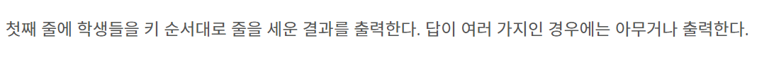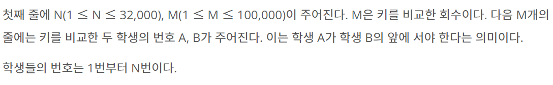 첫째 줄에 N(1 ≤ N ≤ 32,000), M(1 ≤ M ≤ 100,000)이 주어진다. M은 키를 비교한 회수이다. 다음 M개의 줄에는 키를 비교한 두 학생의 번호 A, B가 주어진다. 이는 학생 A가 학생 B의 앞에 서야 한다는 의