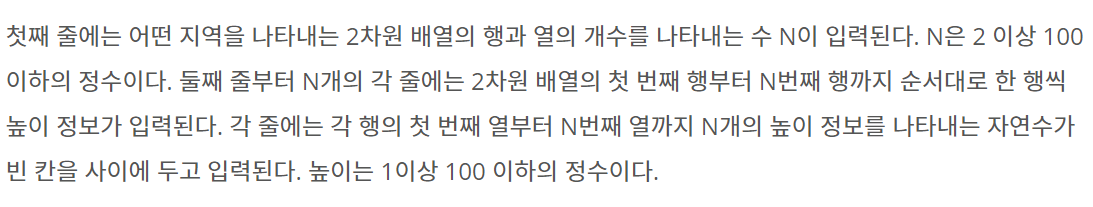 bfs코드를 먼저 짜준다. 그다음 rain이라는 변수를 설정해 입력받은 배열에서 가장 큰 높이까지 한 바퀴를 돌 때마다 값을 하나씩 올려준다.