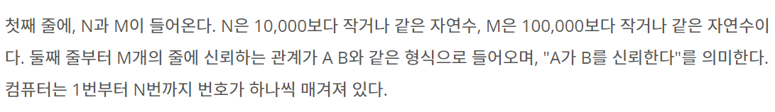 첫째 줄에, N과 M이 들어온다. N은 10,000보다 작거나 같은 자연수, M은 100,000보다 작거나 같은 자연수이다. 둘째 줄부터 M개의 줄에 신뢰하는 관계가 A B와 같은 형식으로 들어오며, "A가 B를 신뢰한