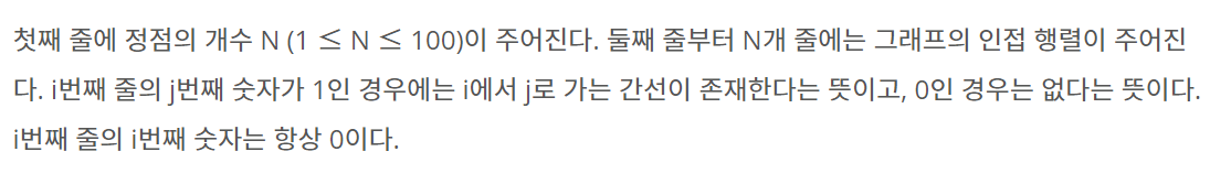 가중치 없는 방향 그래프 G가 주어졌을 때, 모든 정점 (i, j)에 대해서, i에서 j로 가는 경로가 있는지 없는지 구하는 프로그램을 작성하시오.