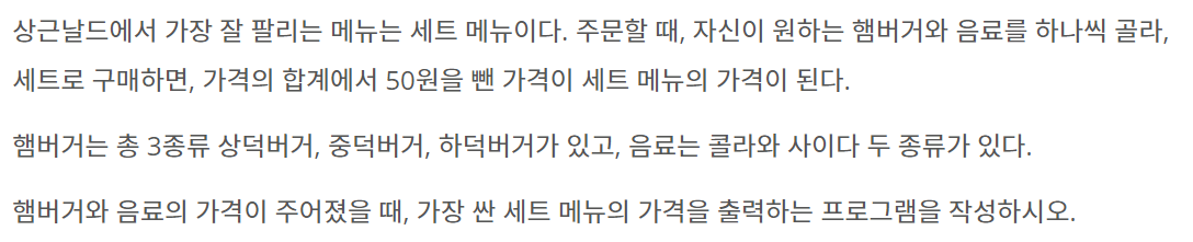 배열에 햄버거 값을 저장해주고 drink 변수를 사용하여 min 값을 비교한다.