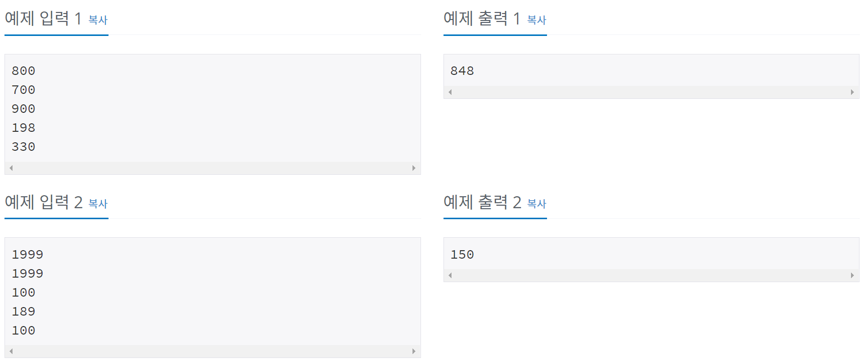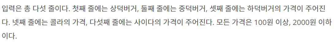 입력은 총 다섯 줄이다. 첫째 줄에는 상덕버거, 둘째 줄에는 중덕버거, 셋째 줄에는 하덕버거의 가격이 주어진다. 넷째 줄에는 콜라의 가격, 다섯째 줄에는 사이다의 가격이 주어진다. 모든 가