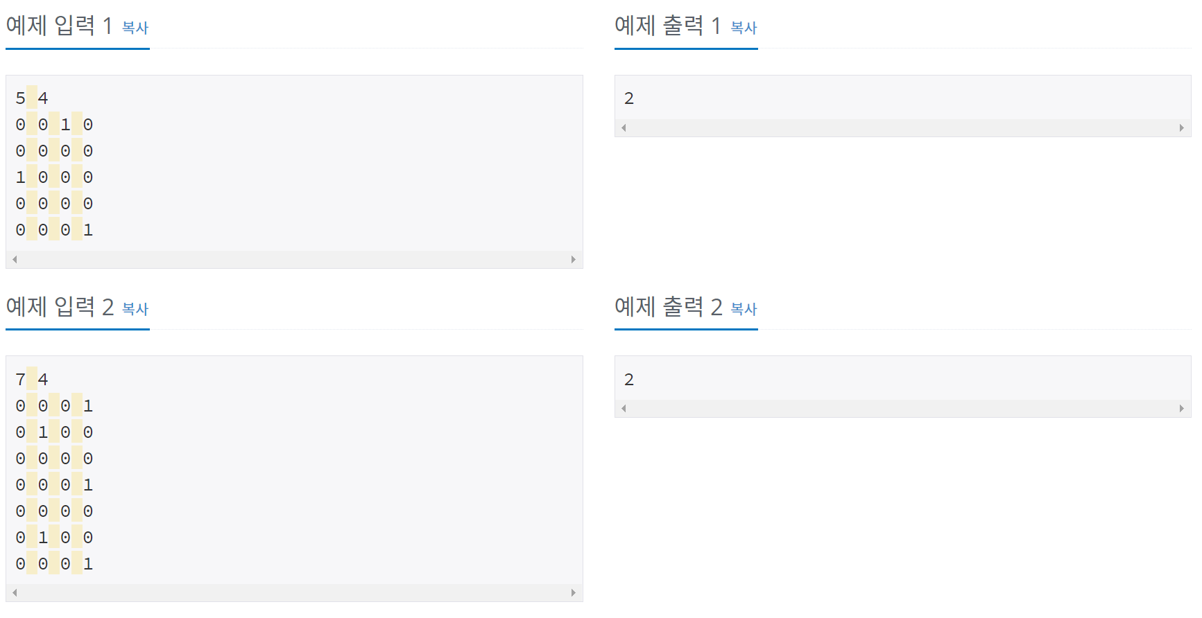 첫째 줄에 공간의 크기 N과 M(2 ≤ N, M ≤ 50)이 주어진다. 둘째 줄부터 N개의 줄에 공간의 상태가 주어지며, 0은 빈 칸, 1은 아기 상어가 있는 칸이다. 빈 칸의 개수가 한 개 이상인 입력만 주어진다.