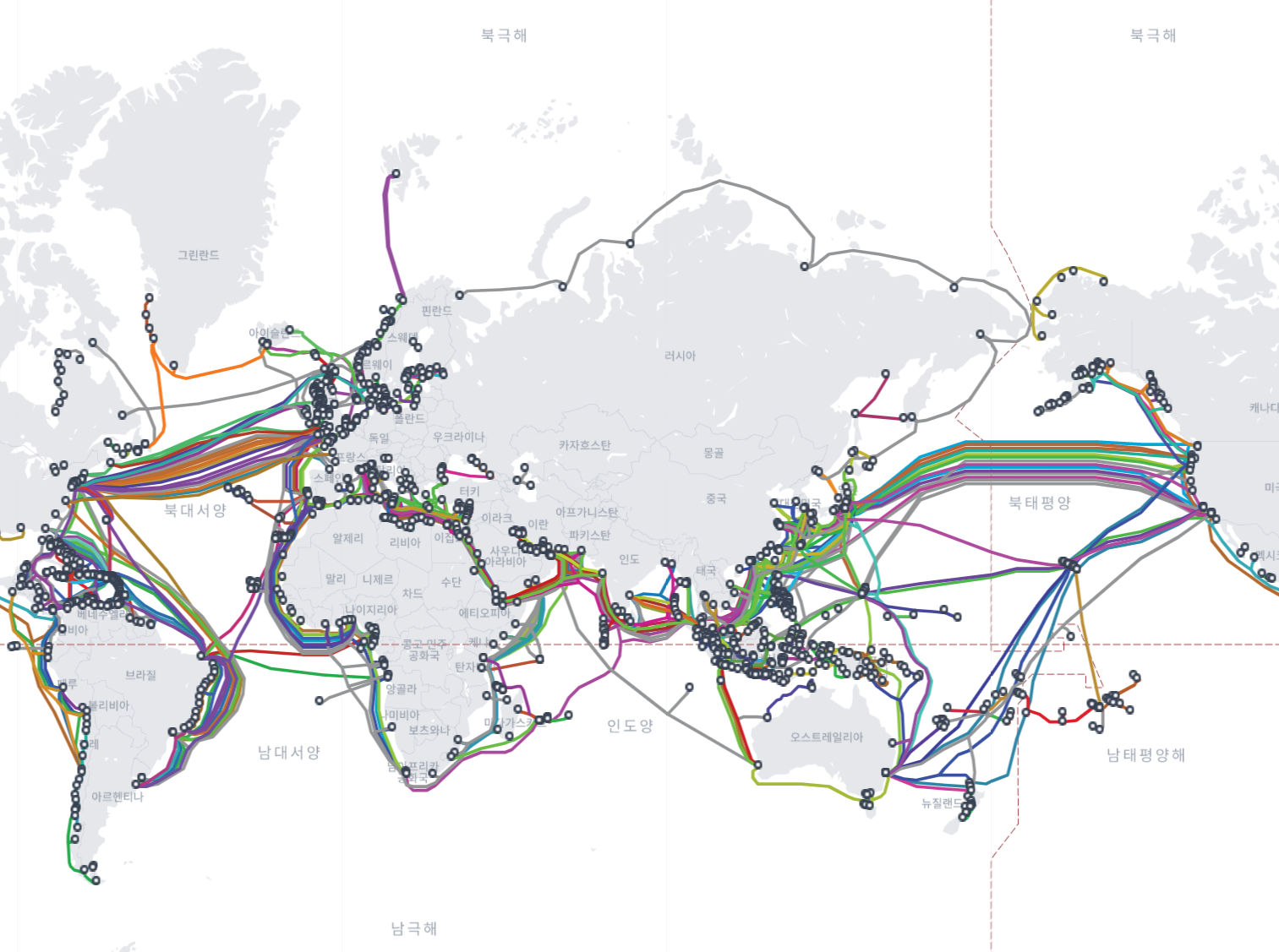 다음 사진은 우리나라를 중심으로 세계가 어떤 식으로 인터넷 백본이 구성되어 있는지 볼 수 있다.