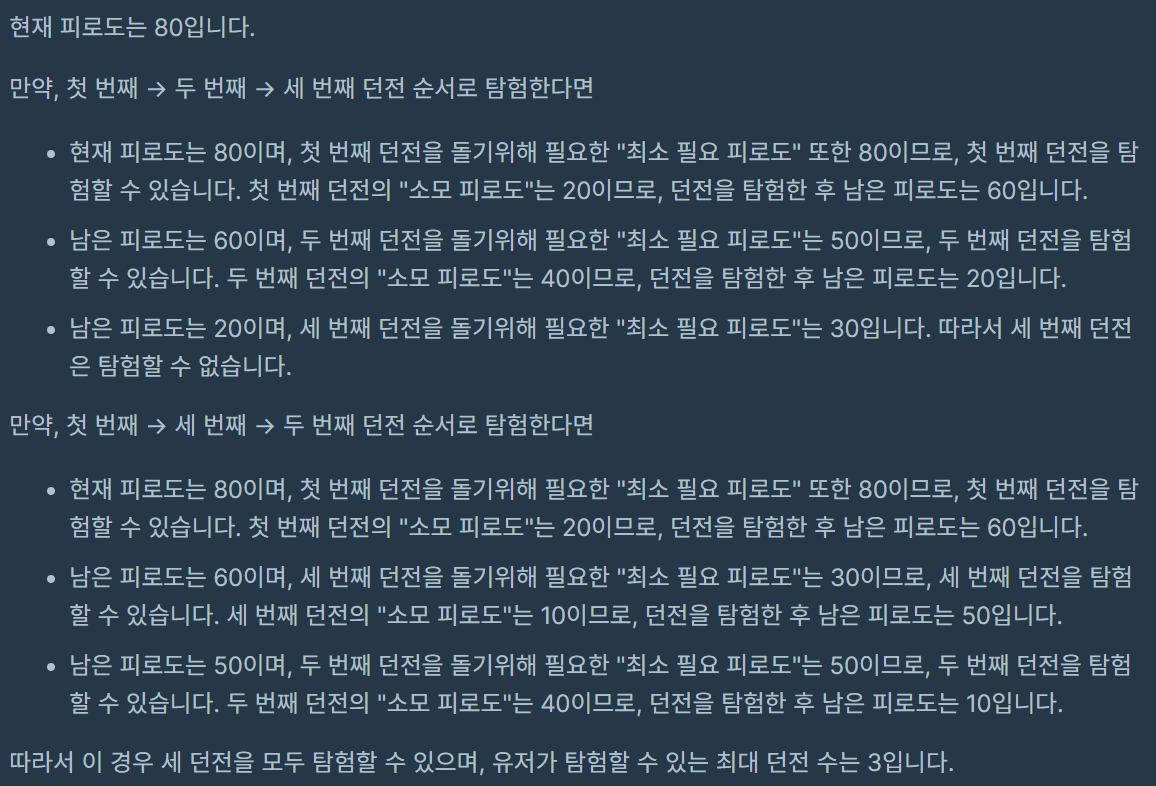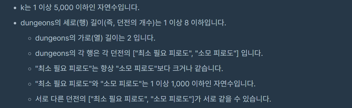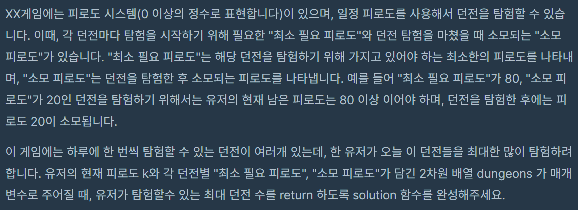 XX게임에는 피로도 시스템(0 이상의 정수로 표현합니다)이 있으며, 일정 피로도를 사용해서 던전을 탐험할 수 있습니다. 이때, 각 던전마다 탐험을 시작하기 위해 필요한 "최소 필요 피로도"와 던