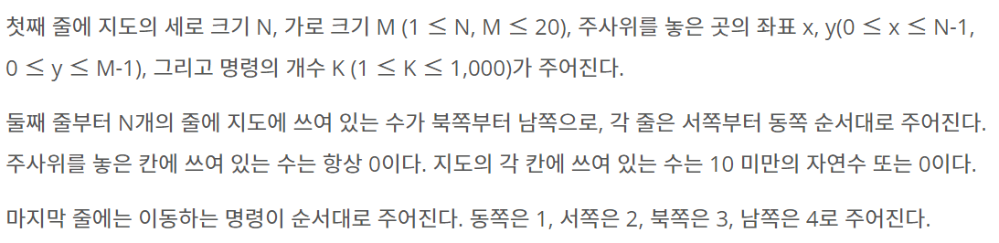 첫째 줄에 지도의 세로 크기 N, 가로 크기 M (1 ≤ N, M ≤ 20), 주사위를 놓은 곳의 좌표 x, y(0 ≤ x ≤ N-1, 0 ≤ y ≤ M-1), 그리고 명령의 개수 K (1 ≤ K ≤ 1,000)가 주어진다. 둘째 줄부터 N개의 줄에 지