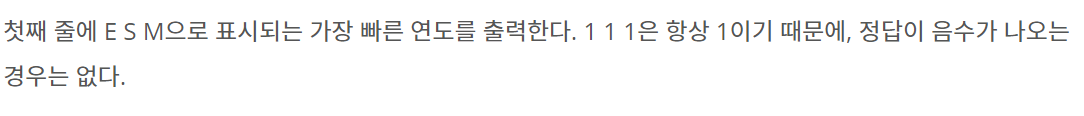 준규가 사는 나라는 우리가 사용하는 연도와 다른 방식을 이용한다. 준규가 사는 나라에서는 수 3개를 이용해서 연도를 나타낸다. 각각의 수는 지구, 태양, 그리고 달을 나타낸다. 지구를 나타