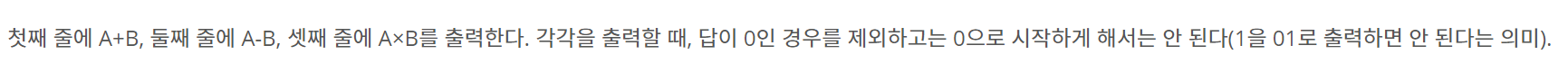 첫째 줄에 A+B, 둘째 줄에 A-B, 셋째 줄에 A×B를 출력한다. 각각을 출력할 때, 답이 0인 경우를 제외하고는 0으로 시작하게 해서는 안 된다(1을 01로 출력하면 안 된다는 의미).