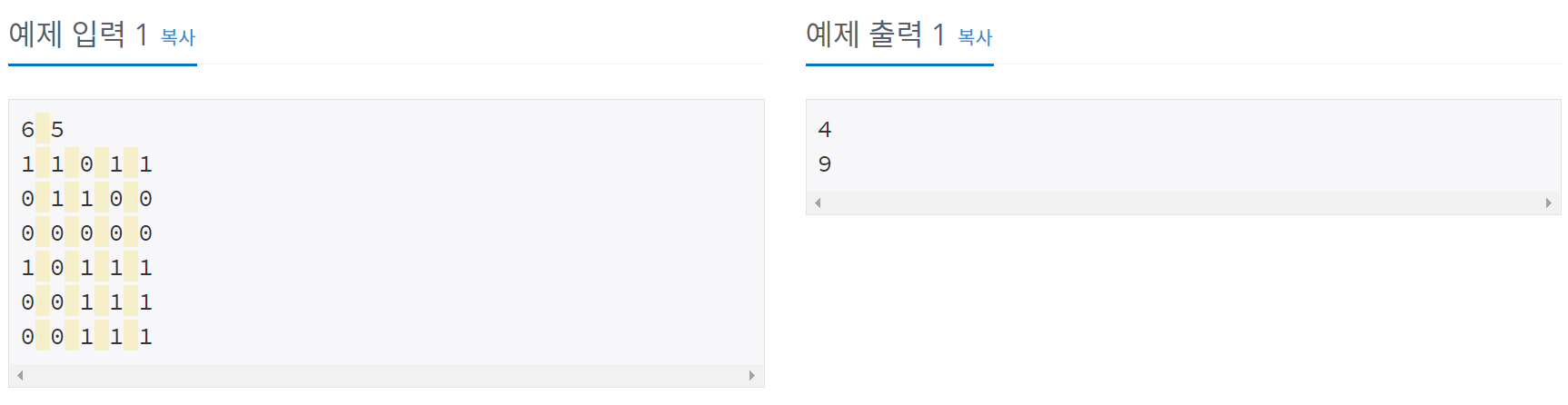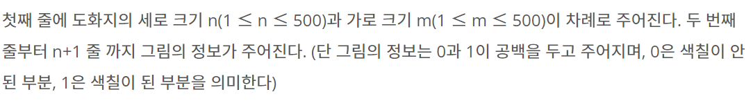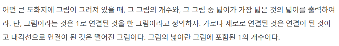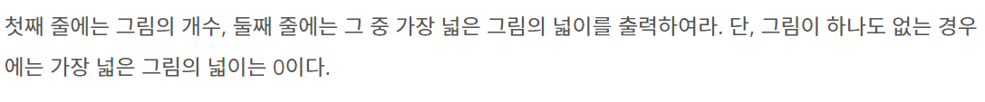 어떤 큰 도화지에 그림이 그려져 있을 때, 그 그림의 개수와, 그 그림 중 넓이가 가장 넓은 것의 넓이를 출력하여라. 단, 그림이라는 것은 1로 연결된 것을 한 그림이라고 정의하자. 가로나 세로