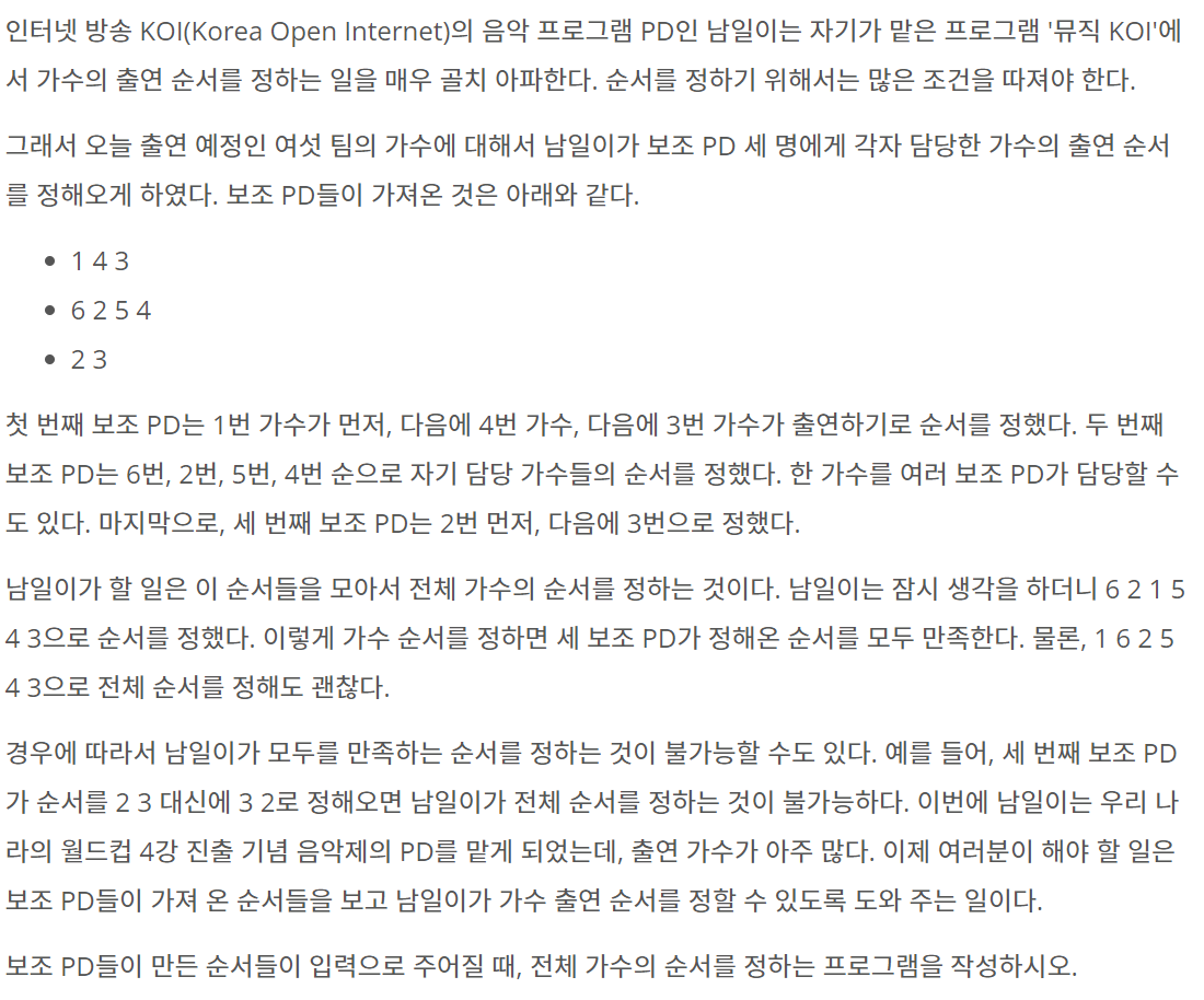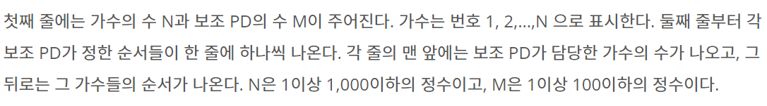 첫째 줄에는 가수의 수 N과 보조 PD의 수 M이 주어진다. 가수는 번호 1, 2,…,N 으로 표시한다. 둘째 줄부터 각 보조 PD가 정한 순서들이 한 줄에 하나씩 나온다. 각 줄의 맨 앞에는 보조 PD가 담당한