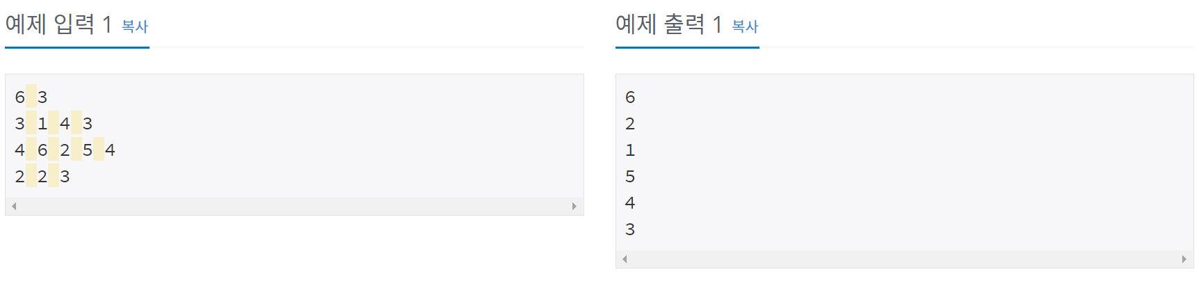 예를 들어 예제와 같이 3 1 4 3이 들어오면 가수의 수는 3이고 순서는 1 4 3이다.