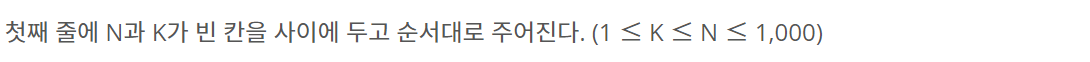 첫째 줄에 N과 K가 빈 칸을 사이에 두고 순서대로 주어진다. (1 ≤ K ≤ N ≤ 1,000)