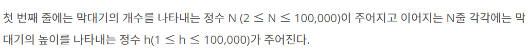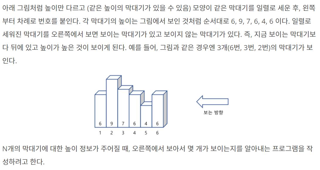아래 그림처럼 높이만 다르고 (같은 높이의 막대기가 있을 수 있음) 모양이 같은 막대기를 일렬로 세운 후, 왼쪽부터 차례로 번호를 붙인다. 각 막대기의 높이는 그림에서 보인 것처럼 순서대로