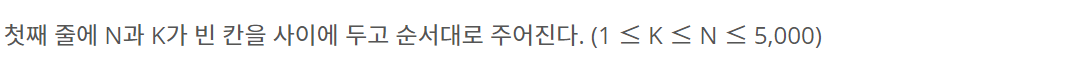 첫째 줄에 N과 K가 빈 칸을 사이에 두고 순서대로 주어진다. (1 ≤ K ≤ N ≤ 5,000)