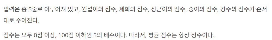 입력은 총 5줄로 이루어져 있고, 원섭이의 점수, 세희의 점수, 상근이의 점수, 숭이의 점수, 강수의 점수가 순서대로 주어진다. 점수는 모두 0점 이상, 100점 이하인 5의 배수이다. 따라서, 평균 점