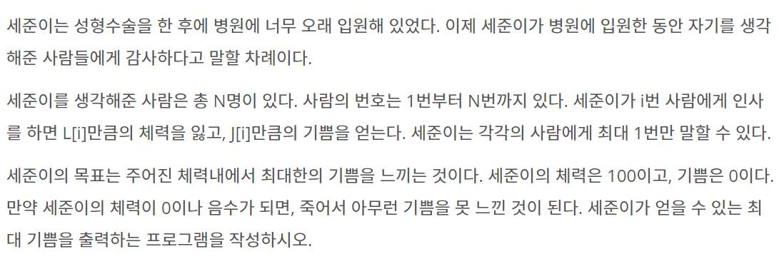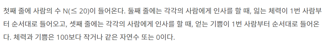 첫째 줄에 사람의 수 N(≤ 20)이 들어온다. 둘째 줄에는 각각의 사람에게 인사를 할 때, 잃는 체력이 1번 사람부터 순서대로 들어오고, 셋째 줄에는 각각의 사람에게 인사를 할 때, 얻는 기쁨이 1번