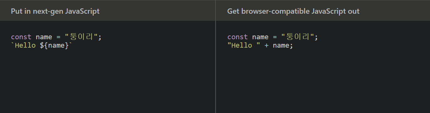 최신 JavaScript 언어를 해석하여 이전 버전을 가진 브라우저에서도 돌아갈 수 있게 문법을 변경해준다.