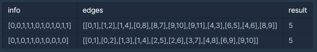 [0,0,1,1,1,0,1,0,1,0,1,1] [[0,1],[1,2],[1,4],[0,8],[8,7],[9,10],[9,11],[4,3],[6,5],[4,6],[8,9]] 5 [0,1,0,1,1,0,1,0,0,1,0] [[0,1],[0,2],[1,3],[1,4],[2,5],[2,6],[3,7],[4,8],[6,9],[9,10]] 5