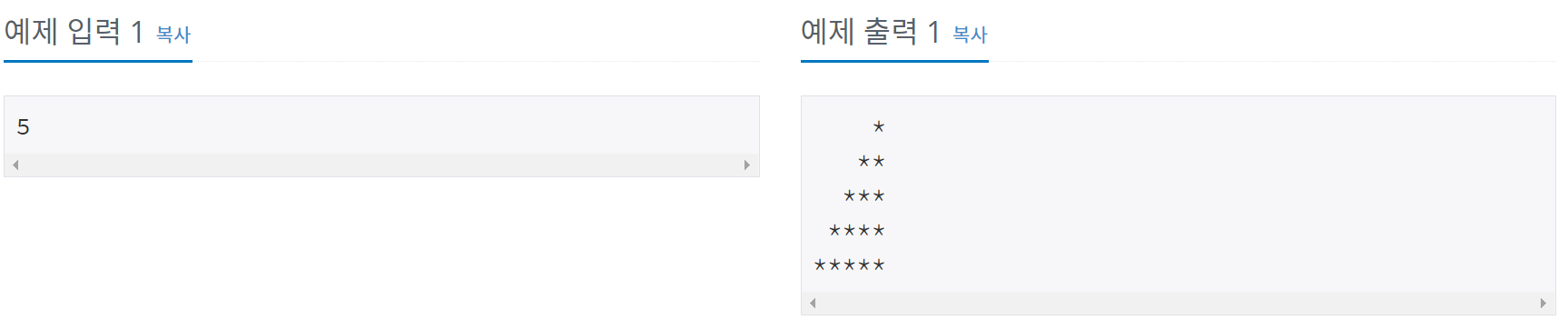 첫째 줄에는 별 1개, 둘째 줄에는 별 2개, N번째 줄에는 별 N개를 찍는 문제 하지만, 오른쪽을 기준으로 정렬한 별(예제 참고)을 출력하시오.